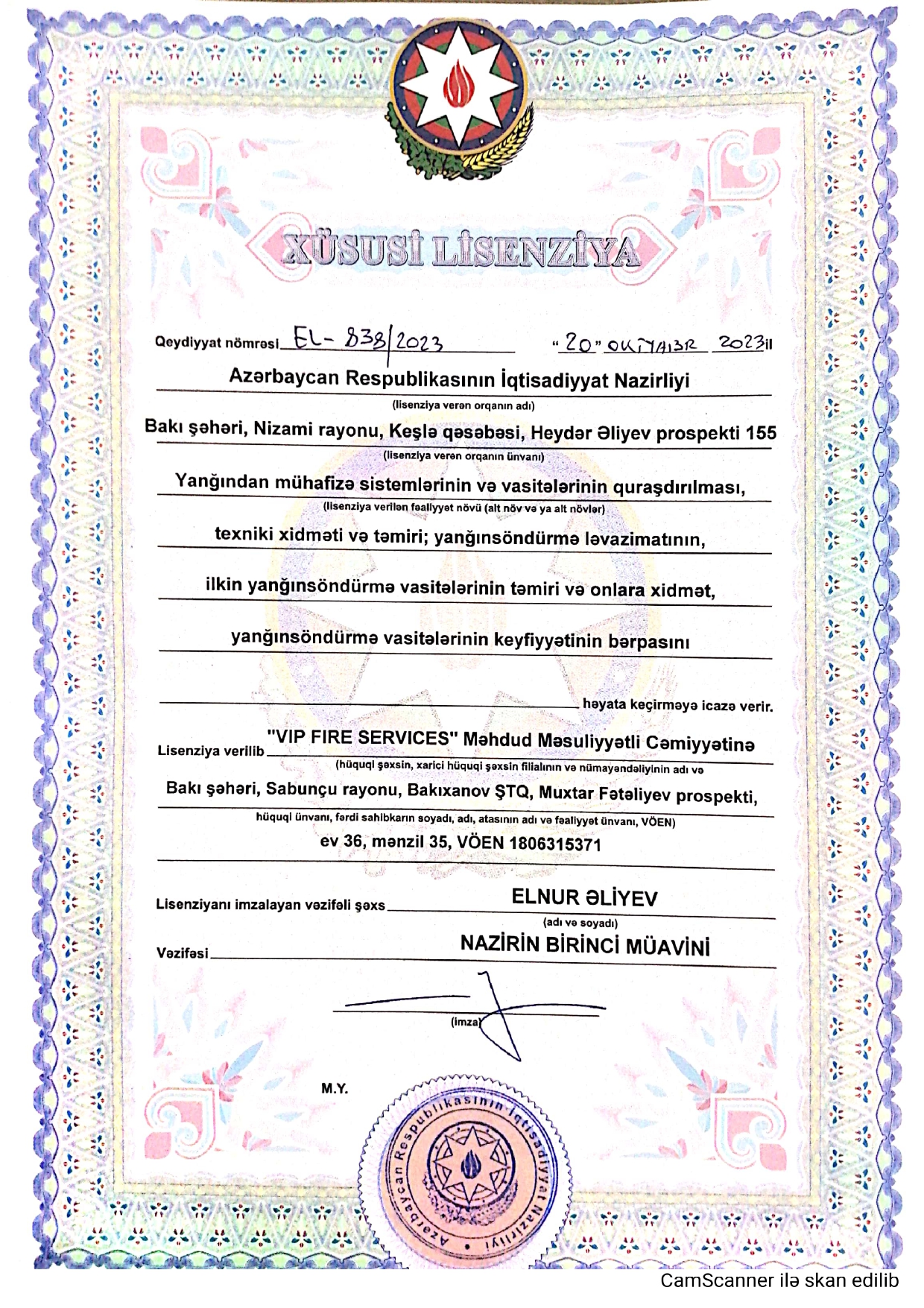 Həmçinin yuxarıdakı fəaliyyət növlərinə görə "VİP FİRE SERVİCES" MMC-nin Fövqəladə Hallar Nazirliyi tərəfindən verilmiş xüsusi razılığa (lisenziyaya) malikdir. "VİP FİRE SERVİCES" MMC yalnız yüksək keyfiyyət sertifikatlarına malik olan avadanlıqları təqdim edir və bir çox tanınmış avropa firmalarının məhsullarının ölkəmizdə rəsmi distribyutorudur.